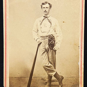 Emanating from the renowned Mark Rucker Collection, this is a c. 1860s CDV image of a ball player in a zouave style uniform; Possibly with a flat sided baseball bat.
